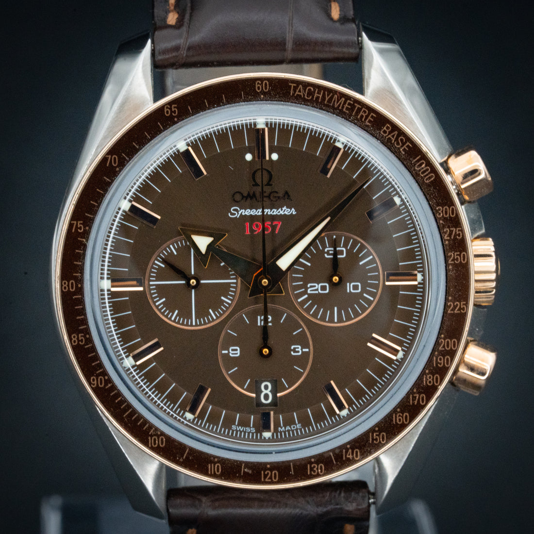 Omega Speedmaster '57 Omega Co-Axial Chronograph Watch - 41.5 mm Steel Case - Brushed Red Gold Bezel - Black Dial - Brown Leather Strap - 331.22.42.51.01.001