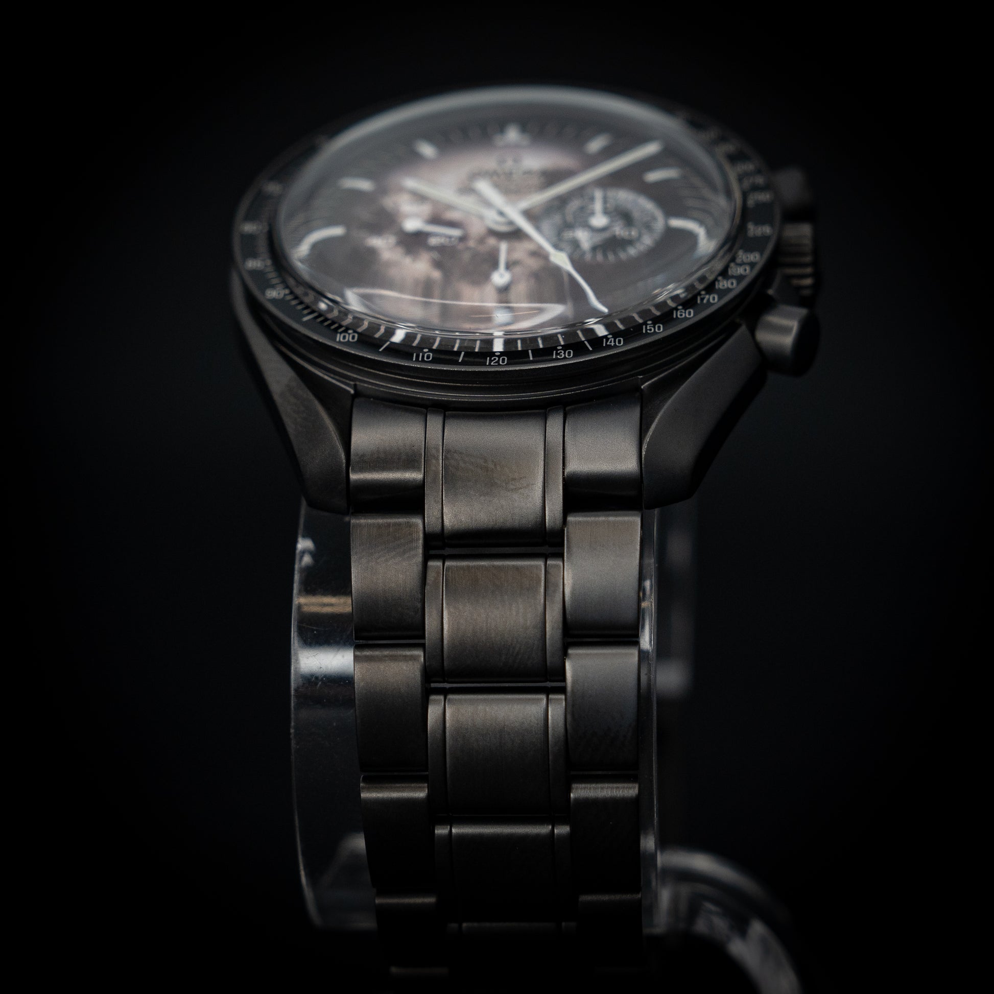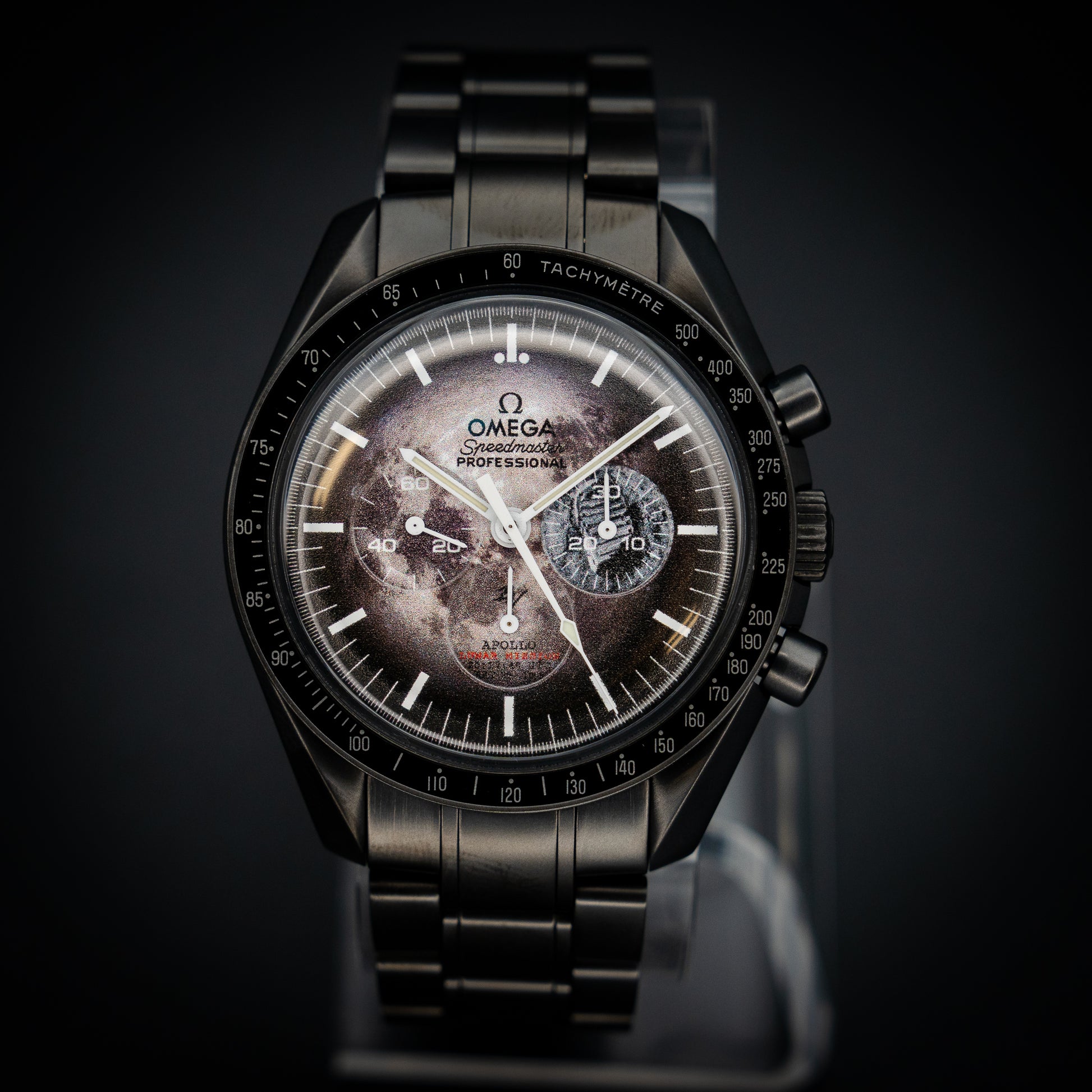 For sale is my, one of a kind, Omega Black Venom Moonwatch with Apollo dial. This watch is dated 07/22 and has a 5 year warranty. This watch has a DLC coating and is in like new condition. Comes with hard case with 2 extra straps and tool. Pictures do not do this piece justice.