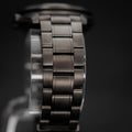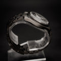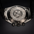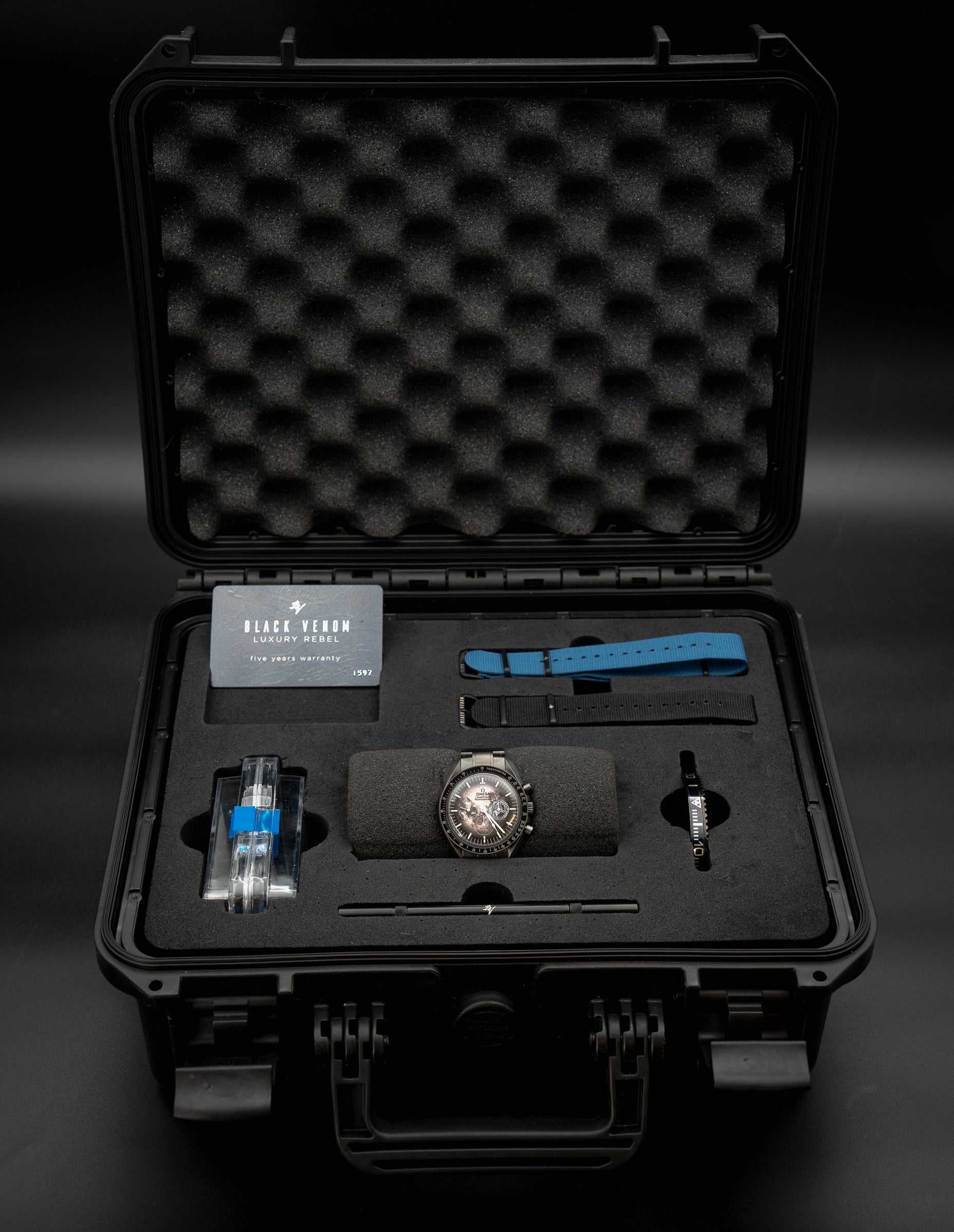 Custom Black Venom 42 mm stainless steel case scratch-resistant sapphire crystal with anti-reflective treatment, black dial, manual-winding Omega 1863 movement with chronograph and small seconds (original movement that was worn on the moon), approximately 48 hours of power reserve, black leather strap with extra NATO and Velcro straps. Water resistant to 50 m.